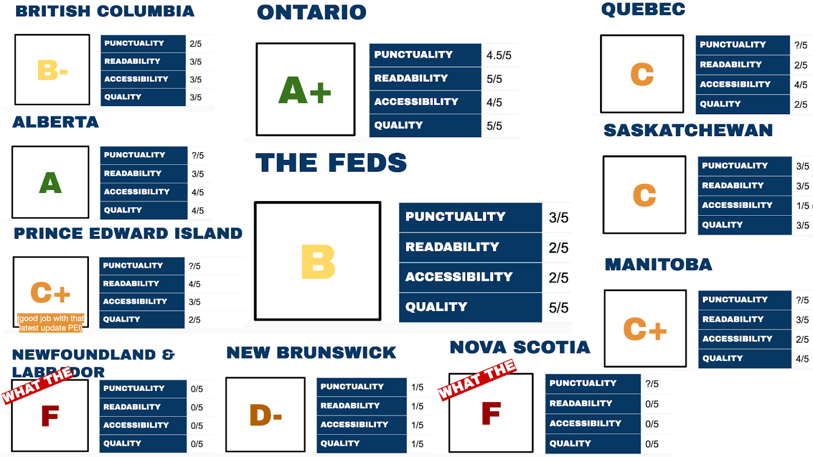 Aedan gave the feds a B, but personally I would give them a C, or a C-. Their punctuality is lacking. Their strongest asset is how high quality it is. The information there is much higher quality than the info in most provinces.
