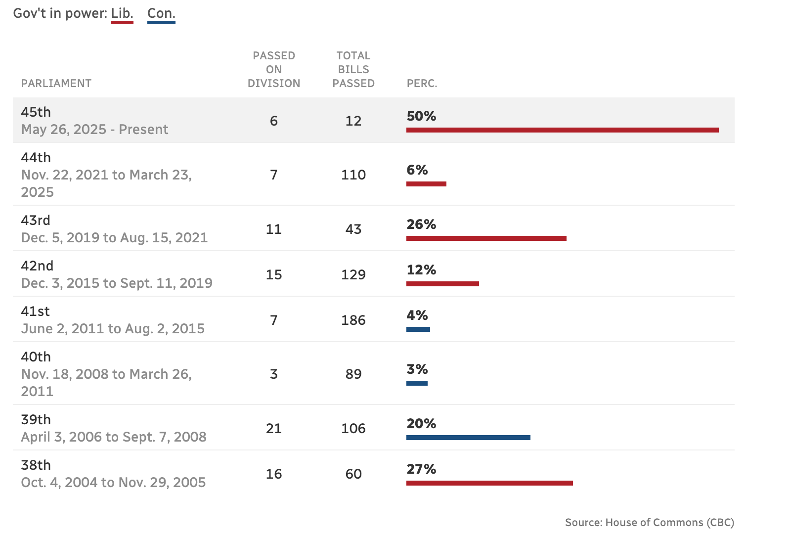 In this wonderful chart by the CBC, we see how many bills have been passed by each Parliament, and we see how many bills have been passed “on division”.