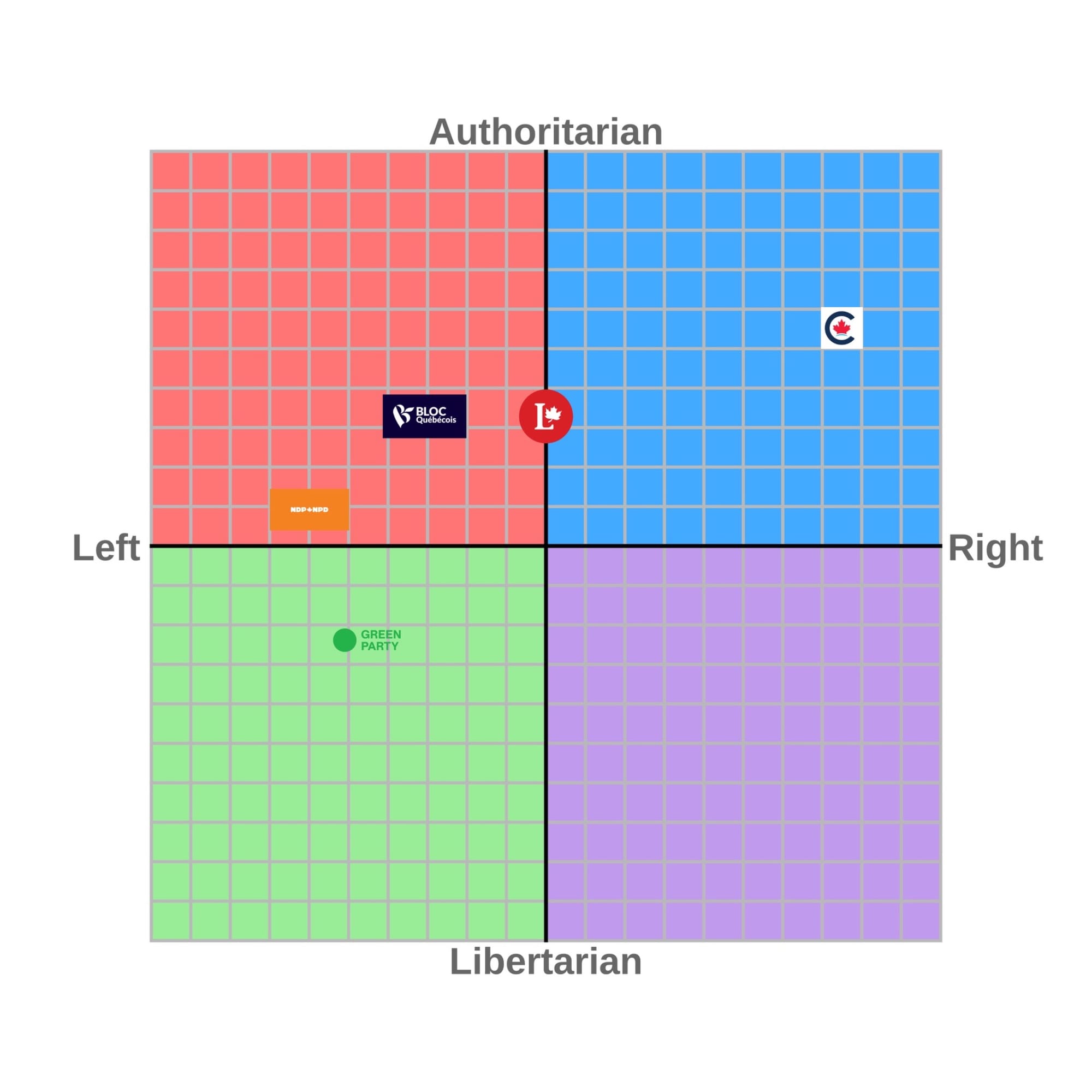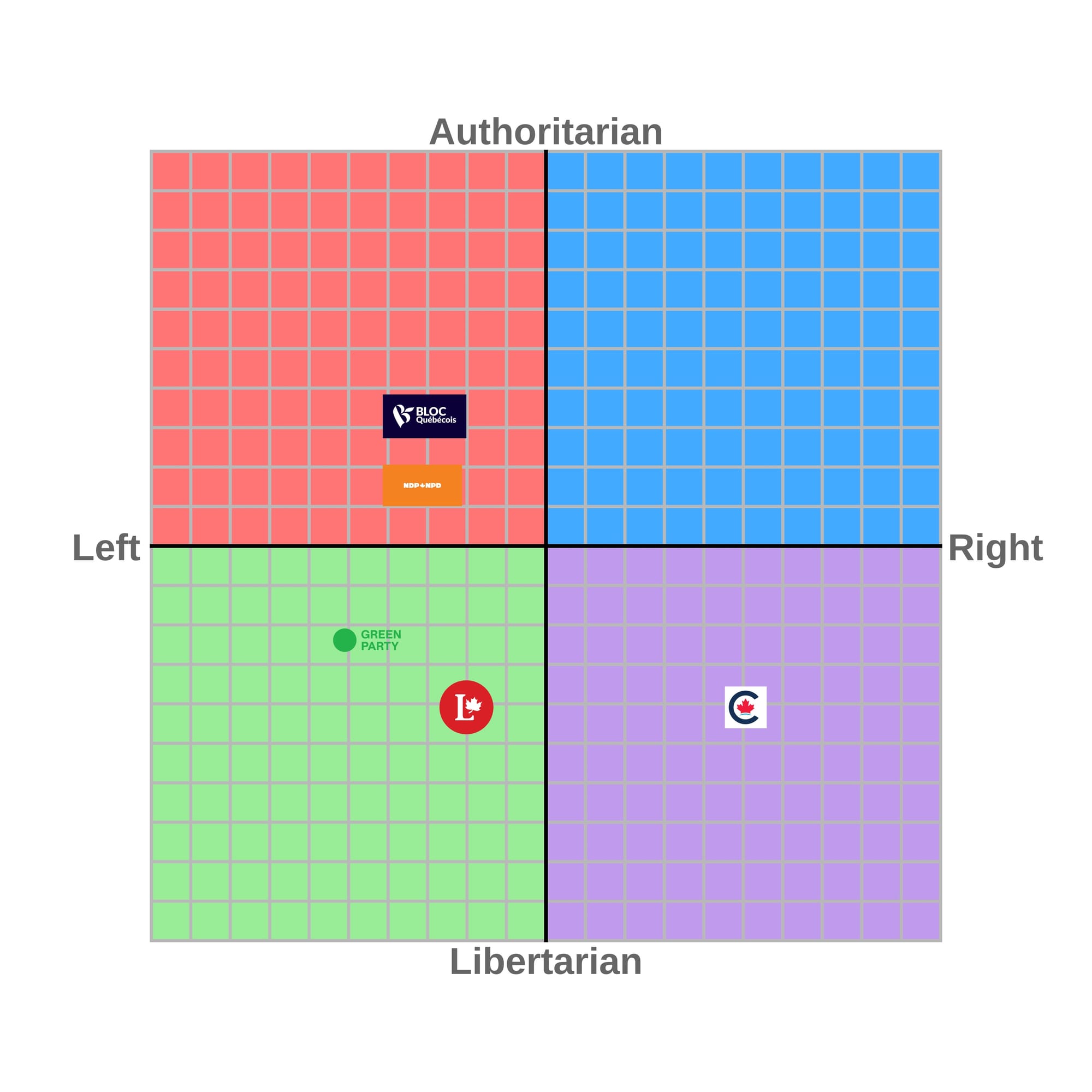 The Liberals are the center. They do some progressive stuff. They do some conservative stuff. They aren’t bound by ideology, they react to what’s going on as they see fit. It is how their tent is so large under Carney, and when we talk about Jean Chretien, we will see how it was similarly large under him. Now, under Trudeau I would have had the Liberals to the left of center, and I would have had them towards the Libertarian end of the scale. Under Carney, they are demonstrating a desire to control speech much more and to pass authoritarian laws, such as Bill C-12.